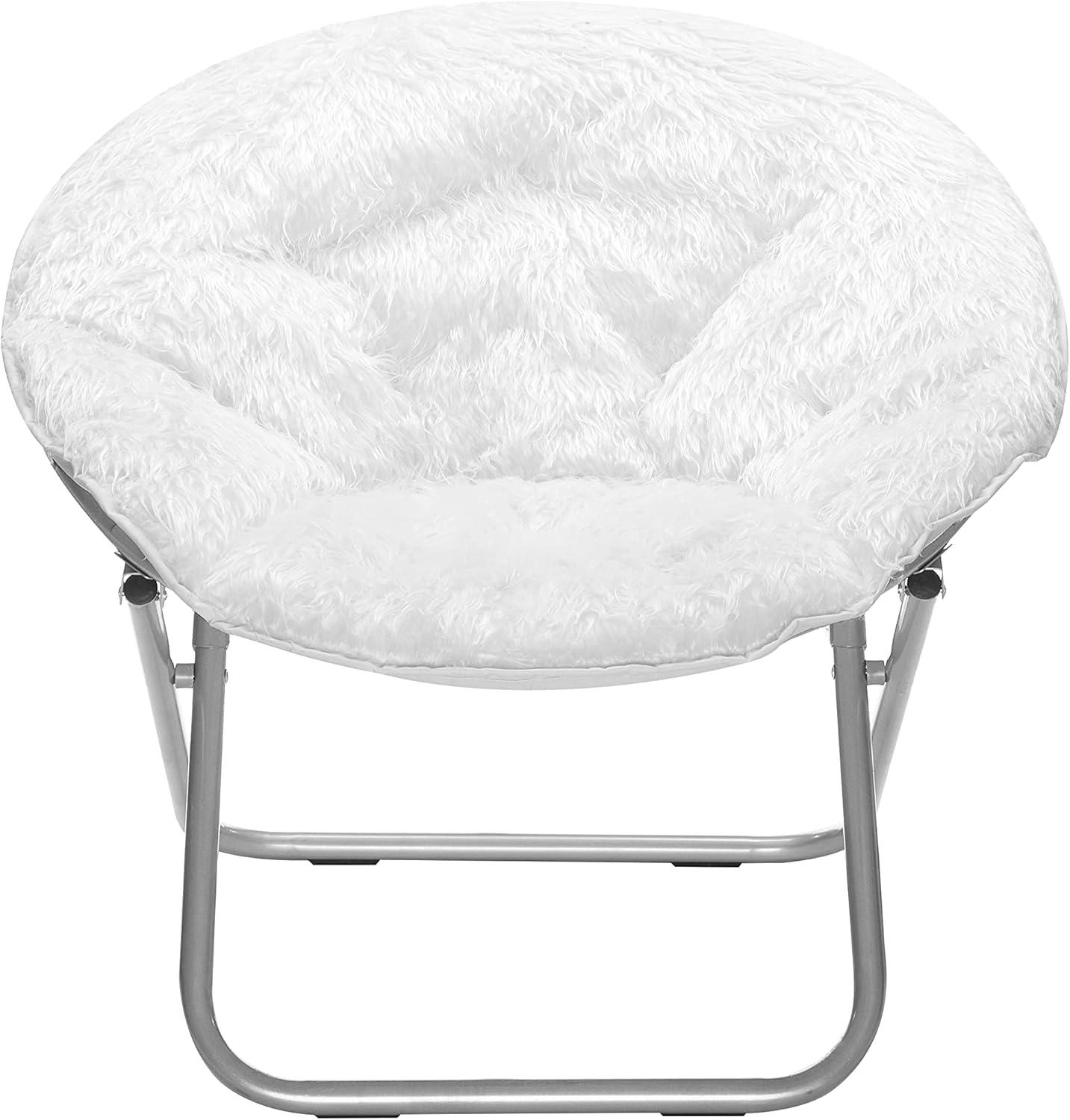 FOLDABLE: A foldable steel frame supports up to 225 lbs and folds flat when not in use, making it easy to hide this faux fur saucer chair out of sight without taking up a significant amount of room in tight spaces. This saucer chair also has a safety locking mechanism on the leg for added support. This saucer chair is easy to transport around making it an item that is easy to carry. Carry this saucer chair with you to your next destination, as it is also travel friendly.